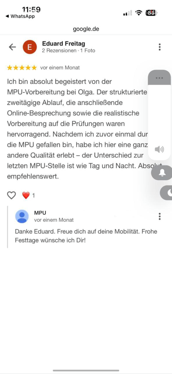 Dabei stehen Vertrauen, Diskretion und individuelle Betreuung im Mittelpunkt. Wir analysieren Ihre Situation ehrlich, entwickeln gemeinsam eine überzeugende Strategie und bereiten Sie intensiv auf alle relevanten Aspekte der MPU vor – damit Sie sicher und selbstbewusst auftreten können.