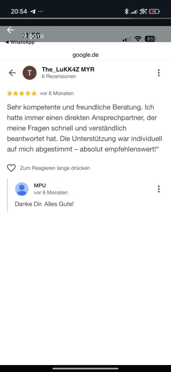 Dabei stehen Vertrauen, Diskretion und individuelle Betreuung im Mittelpunkt. Wir analysieren Ihre Situation ehrlich, entwickeln gemeinsam eine überzeugende Strategie und bereiten Sie intensiv auf alle relevanten Aspekte der MPU vor – damit Sie sicher und selbstbewusst auftreten können.